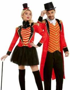 Welcome, one and all, to the Halloween Circus! Delight and spook friends and family with the show you put on in this Deluxe Ringmaster Costume, which features a red vest with a golden shoulder fringe, a mock striped red and orange shirt, and a black skirt, as well as a headband with a hat.