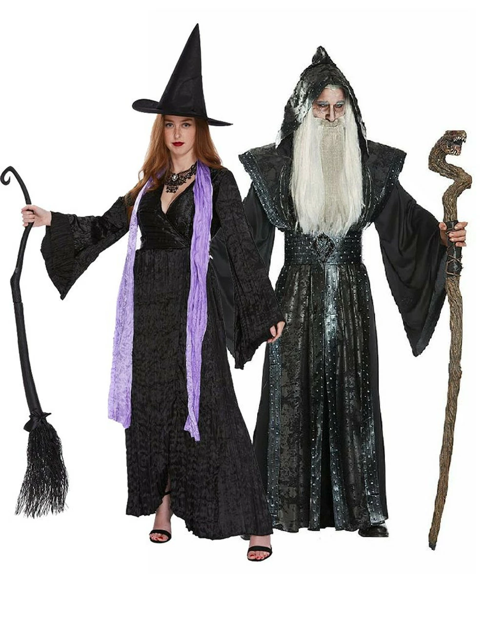 Something wicked this way comes… This beautiful Dark Wizard Adult costume, which includes a floor-length black robe with oversized sleeves, a studded black cloak with pointed shoulders and a pointy hood, and a studded black belt featuring a dragon buckle, will make you want to start brewing potions and casting spells.