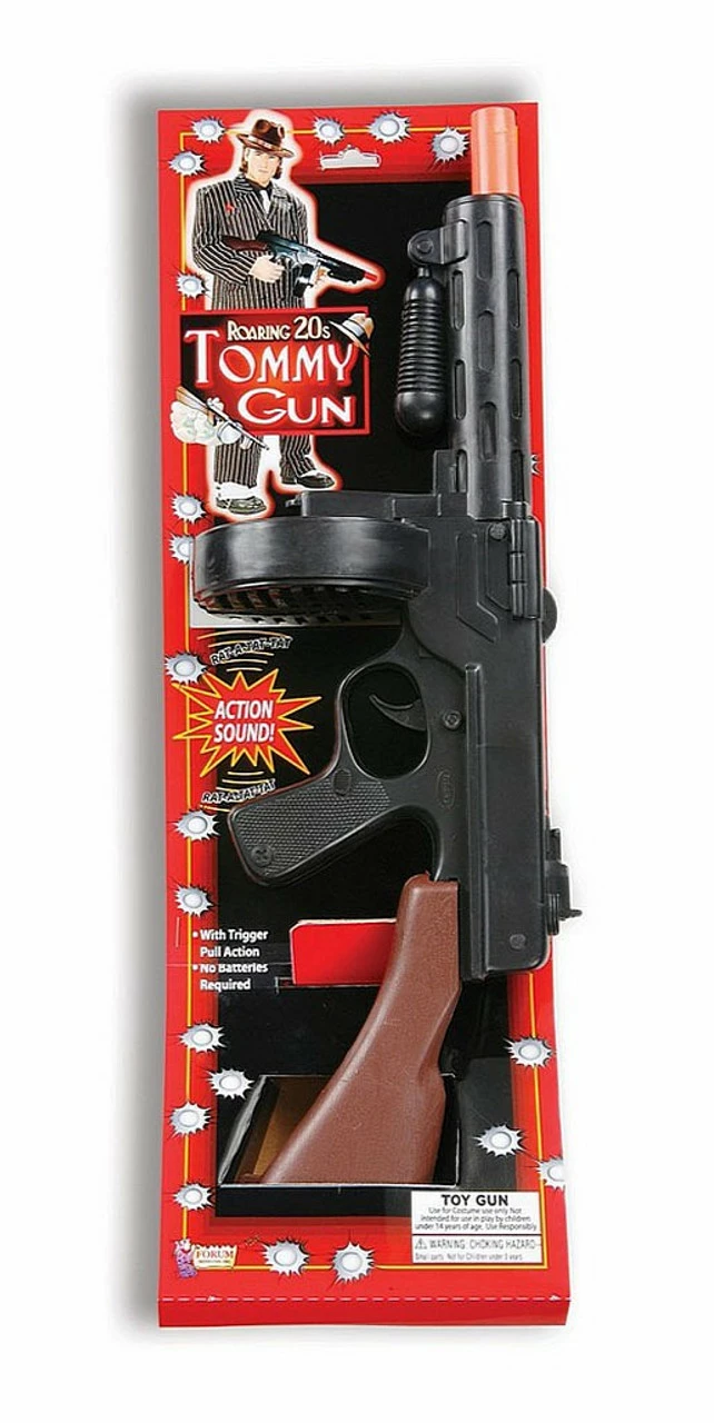 Our favorite machine gun for gangster costumes to make your gangsta costume look even more fierce: this black Tommy Gun is imposing and has a trigger mechanism, and most of all it comes with sound. It is made of black plastic with a brown butt and orange tip. With this accessory, everyone will surely stick ’em up.