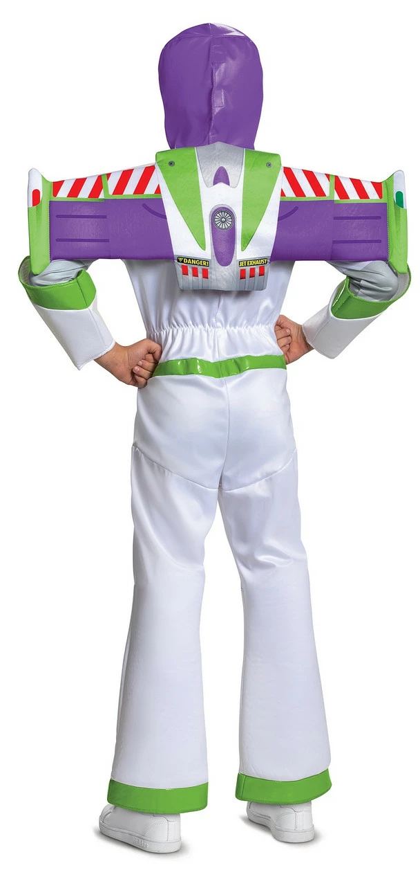 To infinity and beyond! Dress up with the super cool Buzz Lightyear Deluxe Child costume and have wonderful Toy Story adventures in this officially licensed costume featuring a white, purple and green astronaut jumpsuit with a purple hood as well as detachable wings. The colourful controls on the front of the suit, while decorative, bring the extra touch that really bring the costume to life.