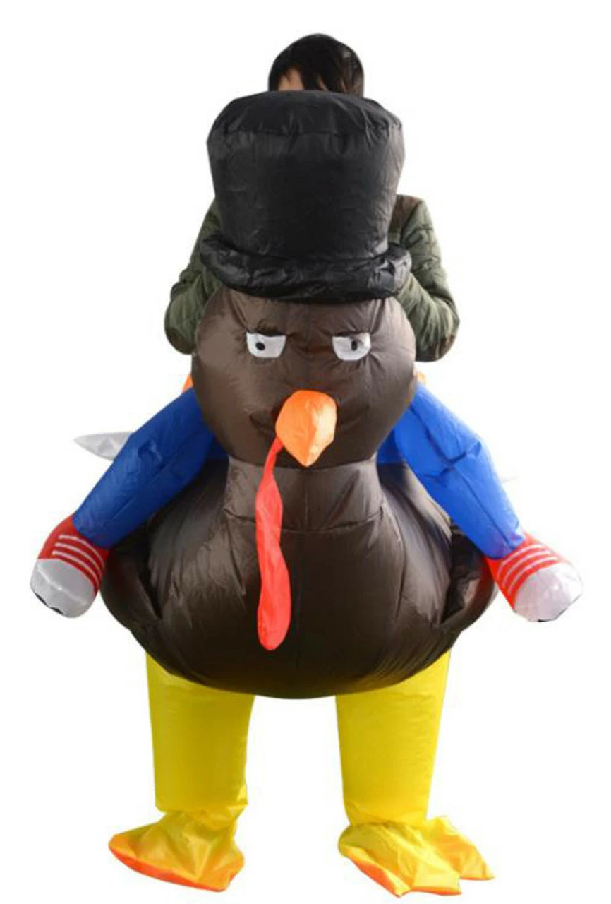 Are you looking for an original costume? This Turkey Inflatable Adult Costume might be just what you need! There’s no such thing as a boring Halloween or Thanksgiving party with the Turkey Inflatable Adult costume. It looks like you are riding this turkey that has a brown body, red and orange tail and mouth, and yellow legs. It has a hat for more fun. This costume is sure to make everyone laugh and perfect for a last-minute costume. This inflatable costume works with a battery operated fan (4 x AA batteries are not included).