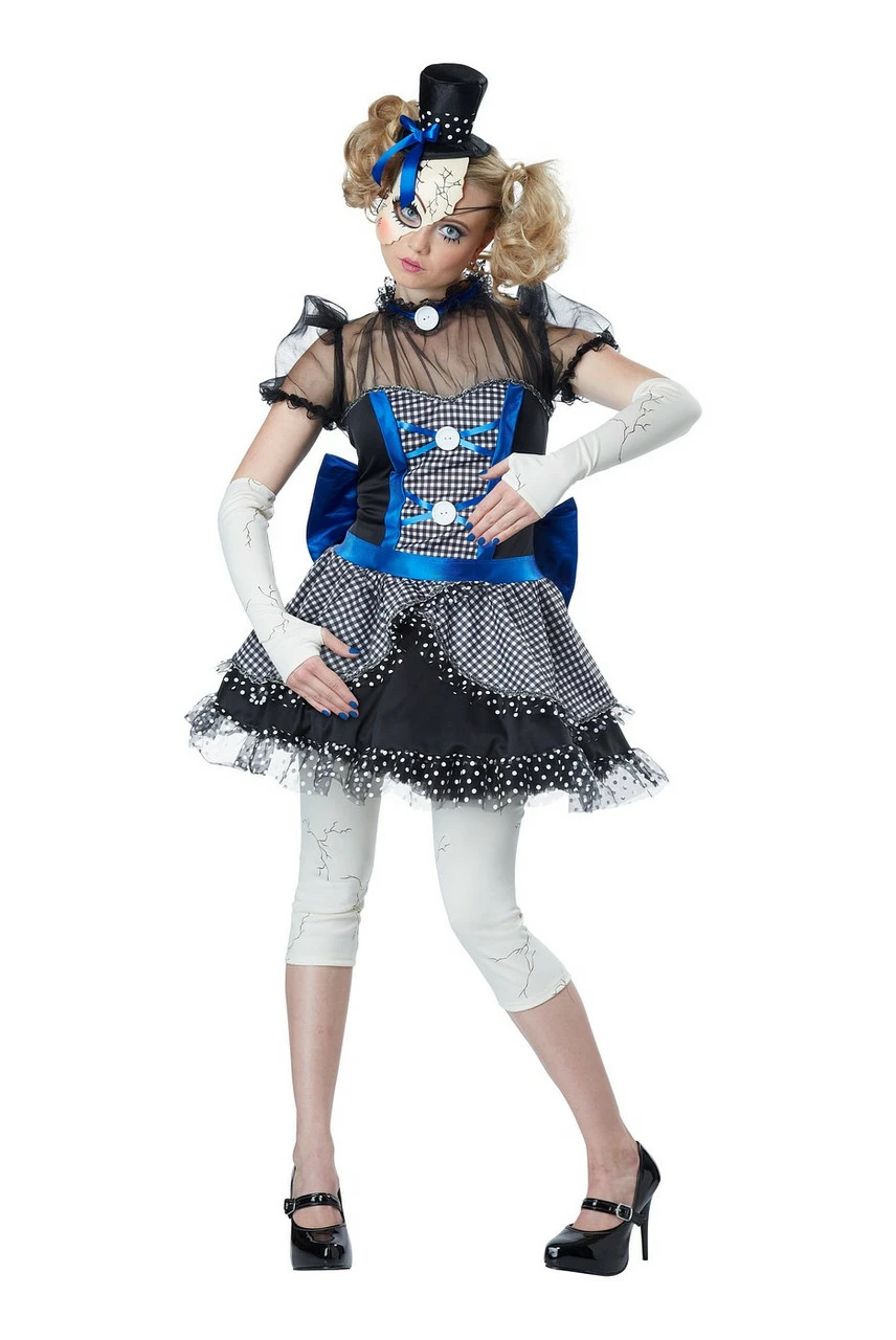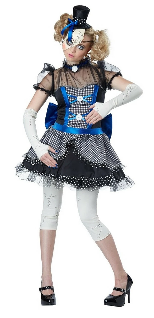 This twisted Baby Doll costume will make a creepy statement at your next costume party or haunted house. The baby doll ensemble includes a blue, grey and black dress with a matching large bow complemented with top hat, opera-length gloves, and leggings. But don’t be fooled by the ruffles and bows! The half-mask reveal all the cracks in the porcelain…
