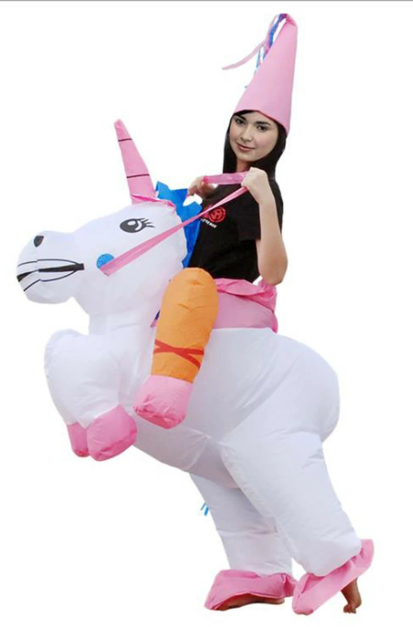 Get ready for a magical Halloween with this hilarious Unicorn Inflatable Adult Costume! The costume features an inflatable unicorn and comes with a whimsical hat. This inflatable costume works with a battery-operated fan (4 x AA batteries are not included). Fan inflates costume in seconds & lasts up to 7 hours.