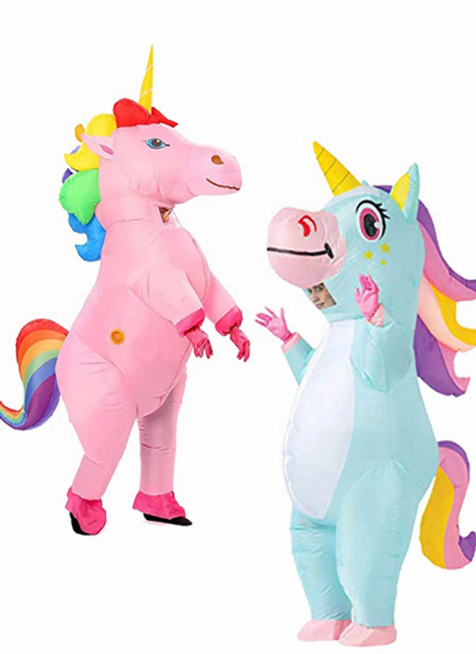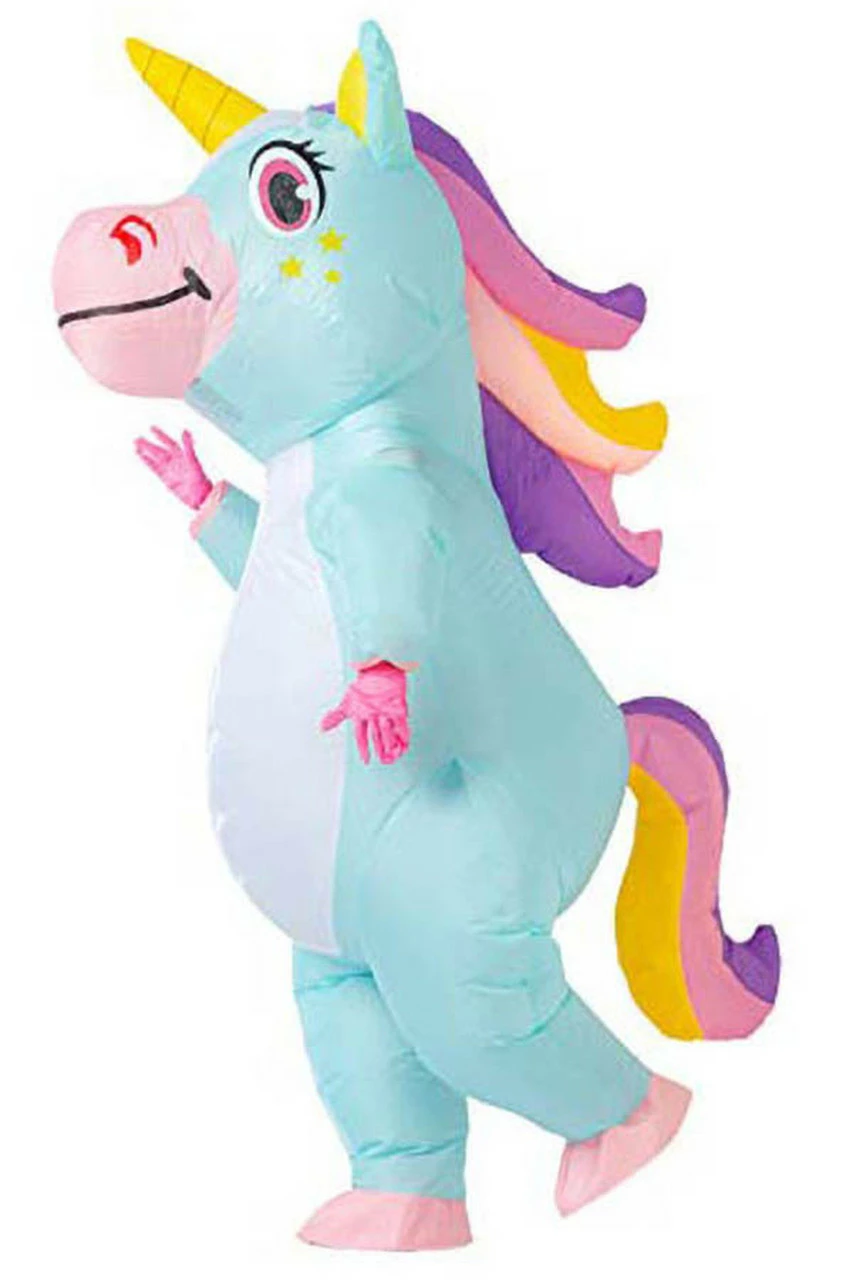 Do you want to be as unique as a unicorn? You will be when you wear this Unicorn Blue Inflatable Adult Costume! This costume features a large blue unicorn with purple, pink, orange and yellow highlights. Pink hooves, and mouth. Cute yellow stars on the unicorns face with a matching horn complete the look! The elastic wrists help maintain the air while being able to freely use your hands. You’ll be able to see where you’re going through the transparent window located on the neck of unicorn. This inflatable costume also includes a usb fan with battery pack to keep the costume inflated.