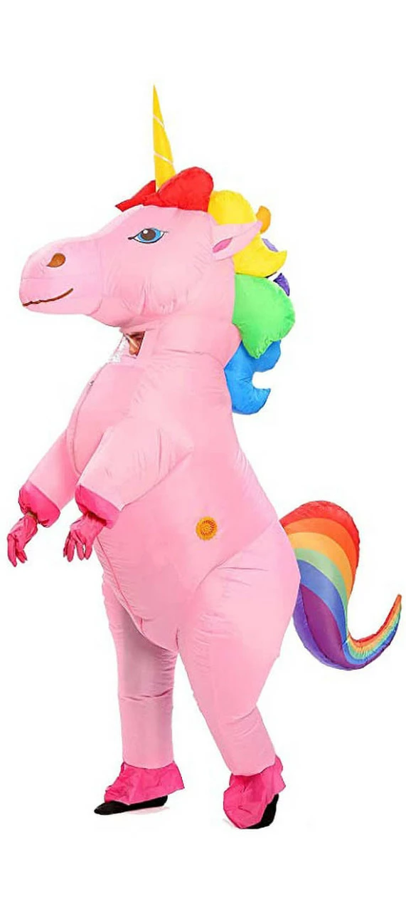 Want to be as majestic as a pink unicorn? You will be in the Unicorn Pink Inflatable Adult Costume. This features a big pink unicorn with a rainbow mane and darker pink hooves and a yellow horn. The elastic wrists help maintain the air while being able to freely use your hands. You’ll be able to see where you’re going through the transparent window located on the neck of unicorn. This inflatable costume also includes a usb fan with battery pack to keep the costume inflated.