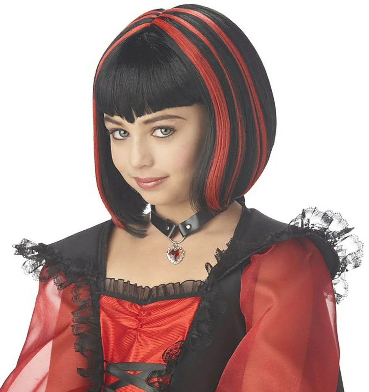 This Vampire Girl Wig with Bob Style Black Hair and Red Strings and Pointed bangs are a perfect accessory for your Regal Vampira Child Costume or any Vampire Costume!