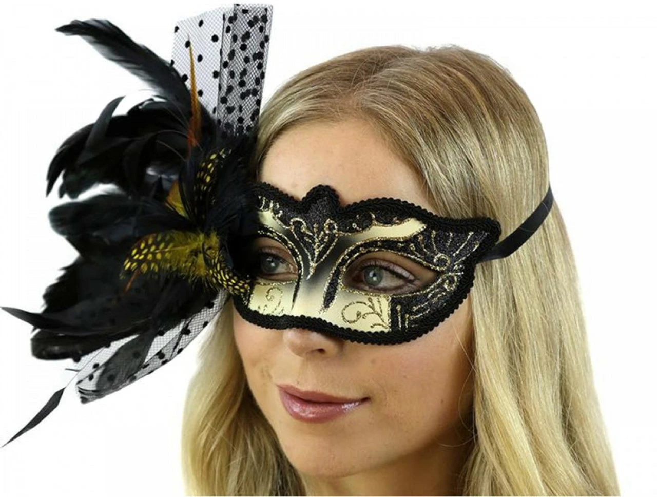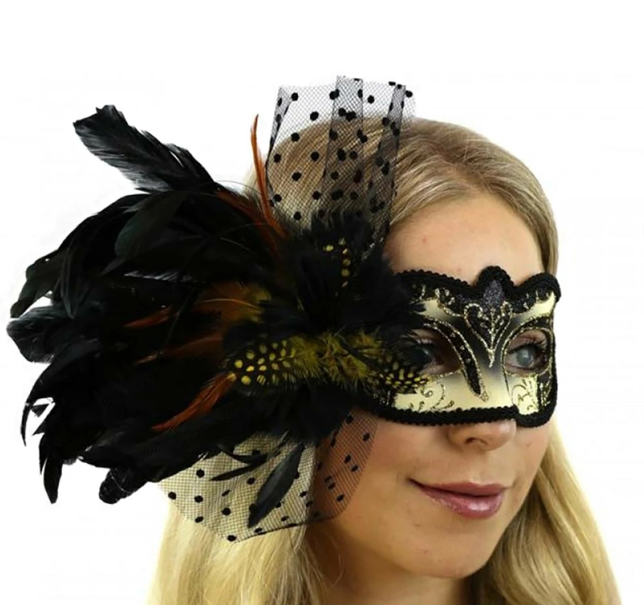 Be the belle of the ball with our Venetian Isabella Mask with Tulle and Feather! Add a touch of glamour to your evening look with our stunning black feather and tulle accents, glitter details, and black trim all around the mask. Perfect for masquerades, proms, or any time you want to put a beautiful finishing touch on your outfit. Let your inner goddess shine with the Venetian Isabella Mask with Tulle and Feather!