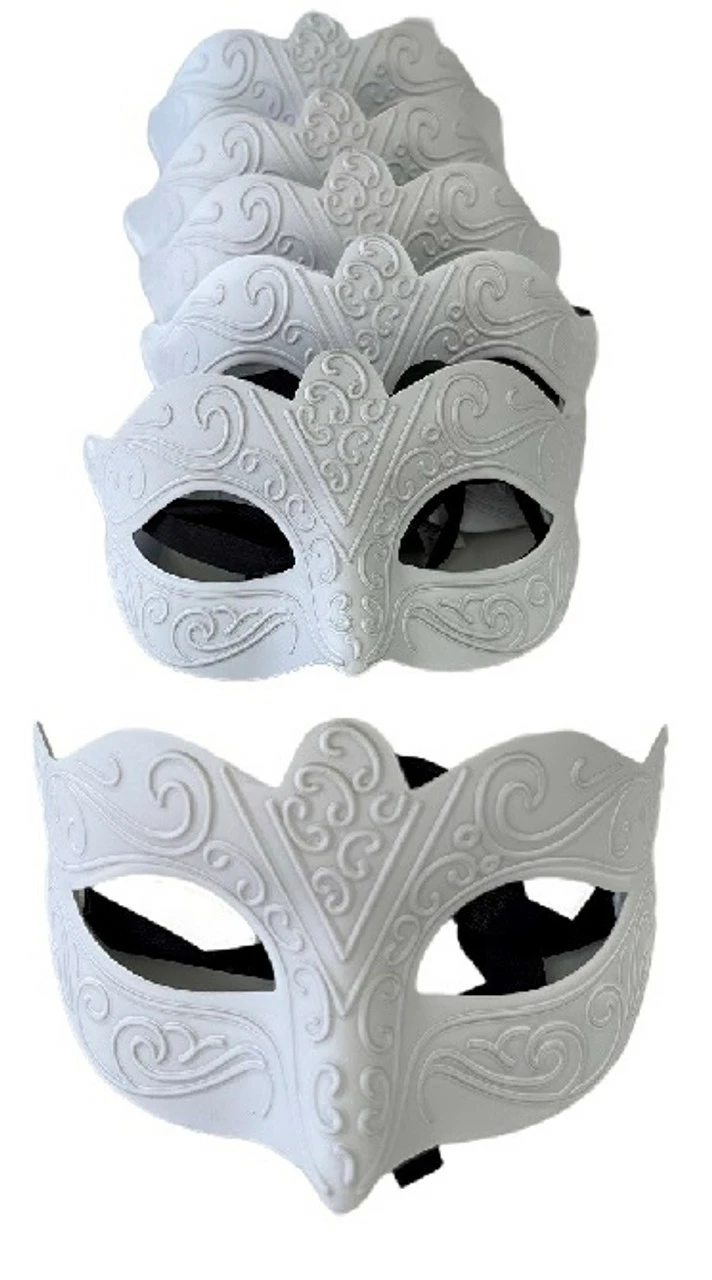 Add a touch of mystery to your masquerade with this Venetian Mask in White. The mask features geometric decoration that bring a rich highlight to the mask. A black ribbon added to each side of the mask allow for a snug fit.