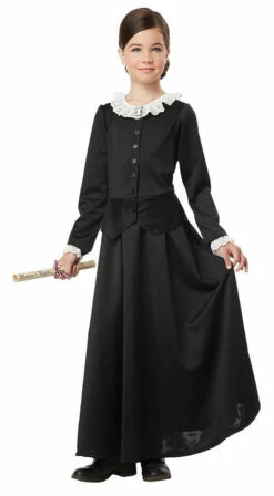 Fight for women’s rights with this Victorian Suffragette Child Costume! This historical costume is perfect for historical recreations and themed parties. It features a long black dress with lace cuffs, a pretty lace collar, a ruffled collar, a hair wrap, and a small cameo for your collar. You can mix and match the accessories to customize your look!
