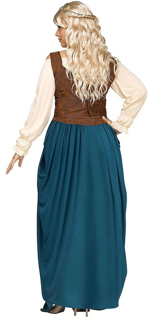 Rule the world in this Viking Queen Plus Costume! It includes a beautiful Viking gown with a brown waist cincher and a blue skirt drape, and a belt with a pouch. Step aboard your Viking boat in this stunning costume!