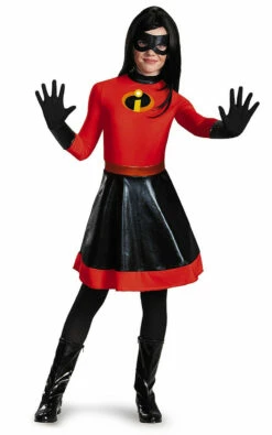 Violet Incredible is a teen superhero with the ability to make herself invisible and create forcefields. When we meet her at the beginning of the first Incredibles movie, Violet is shy and hides behind her hair, but she grows braver as her confidence in herself and her power increases. You can embody this incredible supeheroine in this officially licensed Violet Tween Costume! It includes a red dress with the Incredibles’ “i” logo on the chest and a black skirt with a red border, as well as black footless tights, black gloves, and a black hero mask.