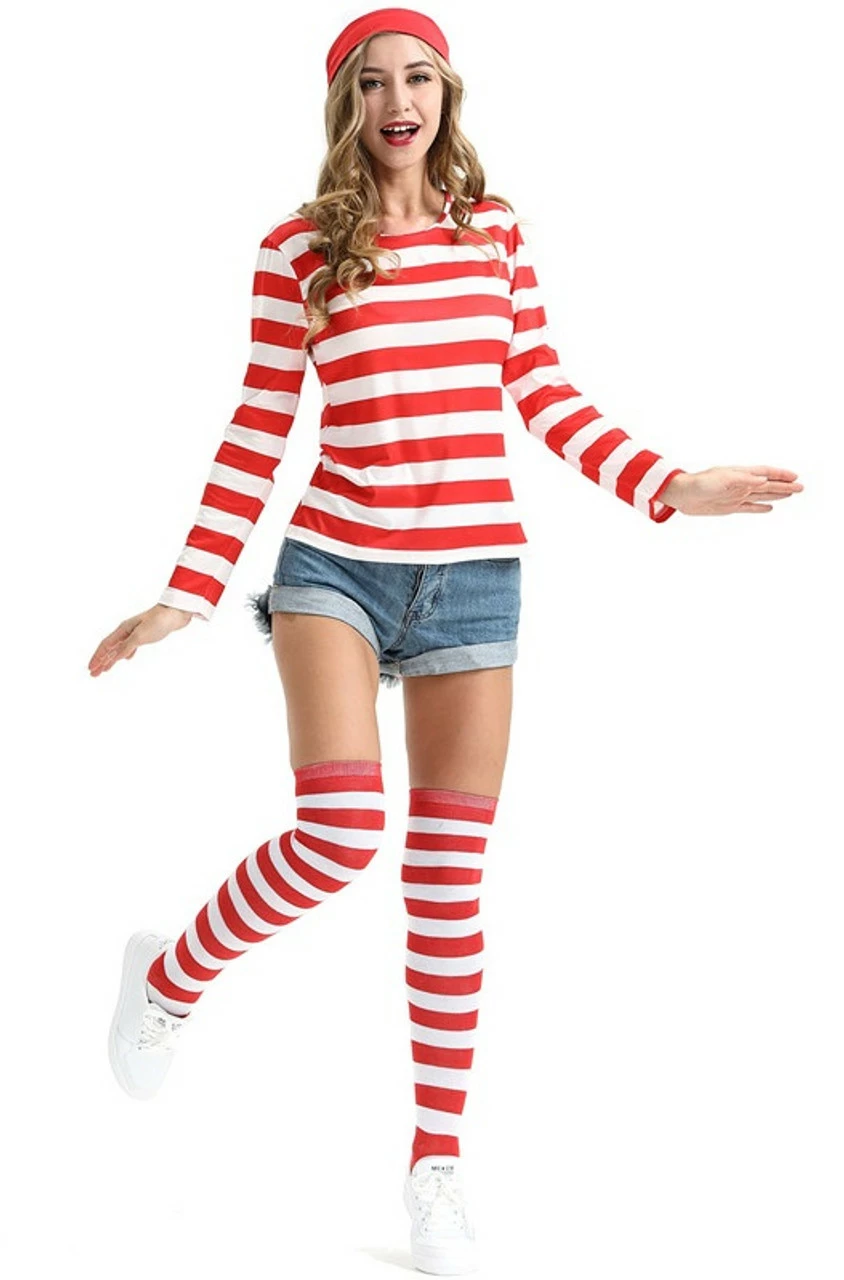 They won’t be able to find you… wearing anything but this costume on Halloween! White and Red Striped Shirt Women Costume includes black glasses, a white and red hat with a red pom pom on the top and a striped red and white shirt. The matching red and white striped socks complete this look.