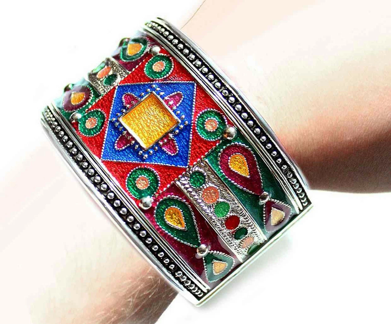 Wear this with any Gypsy or Arabian costume or with your own clothes and look absolutely amazing. It includes a silver hinge bracelet with a colorful design.