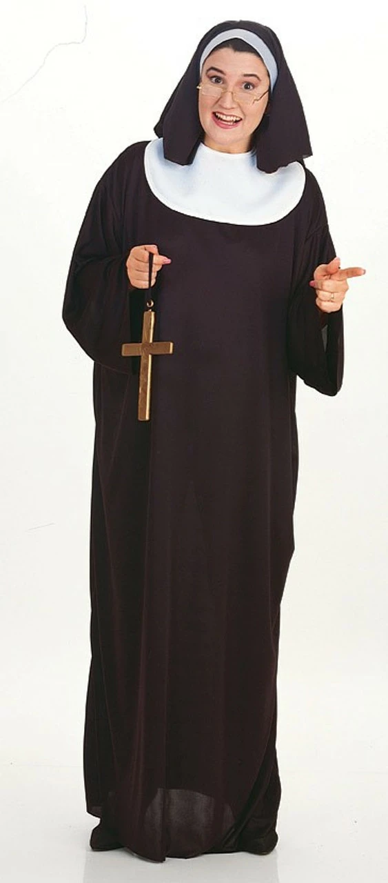 Show up at the party with the Nun Adult Costume and shock your friends how innocent you can look. The Nun Adult Costume features a black dress with white collar, and black and white headpiece. The cross is sold separately. This costume is a plus size costume. The Nun Adult plus Costume will surely be a crowd pleaser.